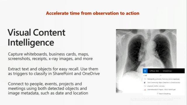 The example they gave was of a scanned receipt that had “Ribeye” on it. The presenter recalled having a really great ribeye steak, but couldn’t remember the name of the restaurant. She searched on “ribeye” and found the receipt, which had the restaurant listed.