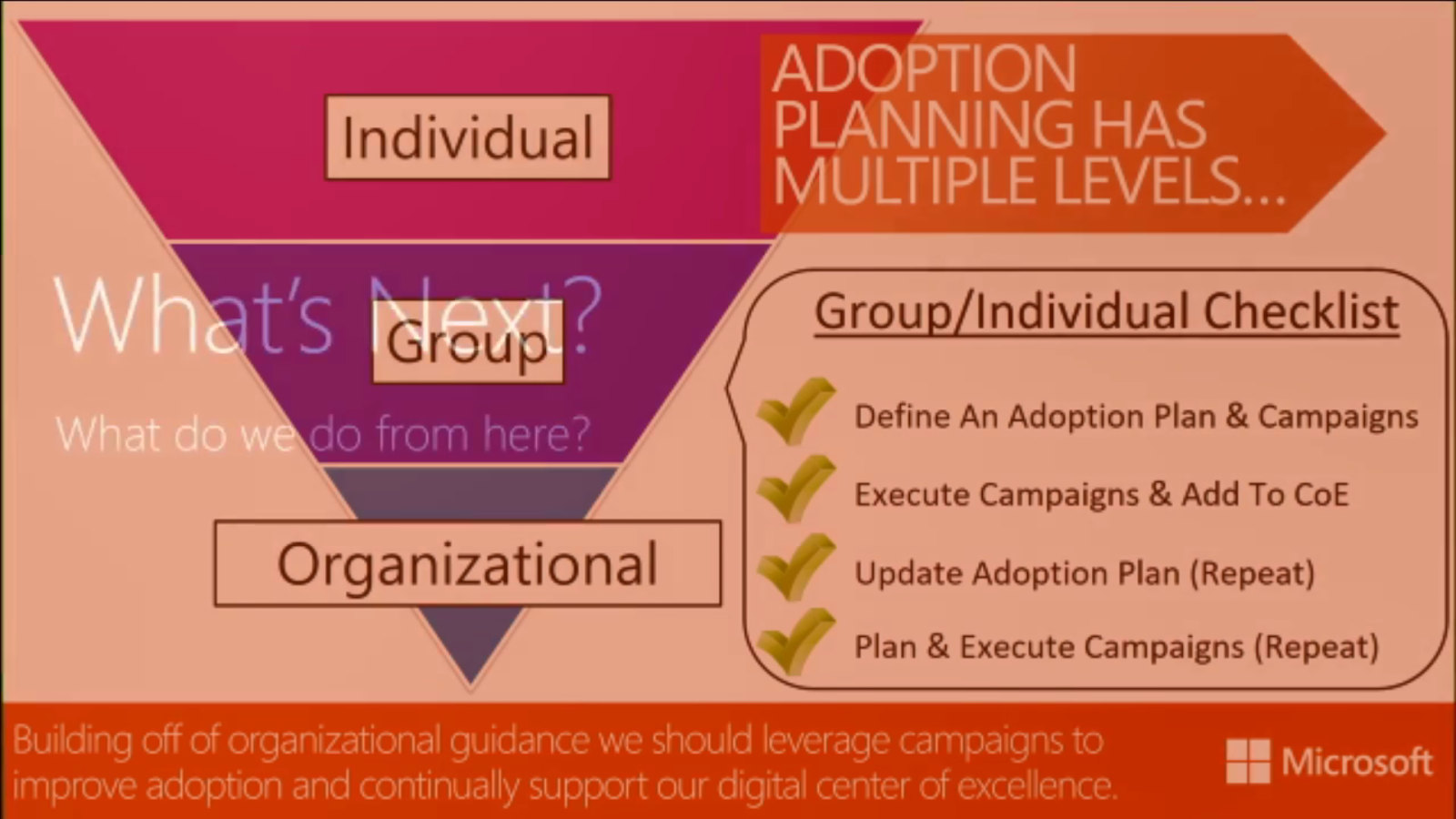 Office 365 provides an incredible amount of value to individual employees, teams, departments, and organizations. Much of this value is not realized immediately upon purchase or deployment of Office 365. The value is realized as more and more users understand, adopt, and embrace the technology. So how do we drive faster, sustainable and effective adoption? Perhaps more importantly, how do we ensure our adoption approach scales and can keep up with the innovation the Office 365 service provides?