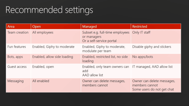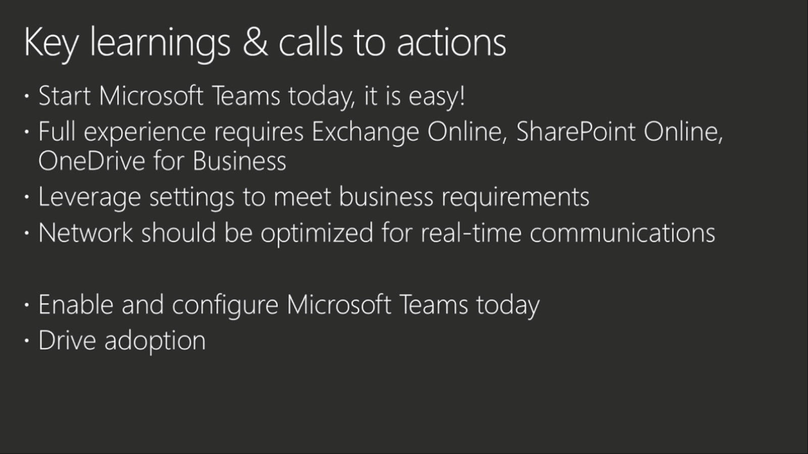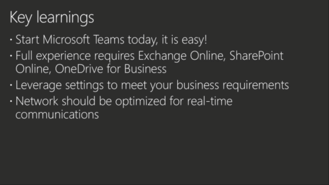 In this session we talk through all the steps required to get started with Microsoft Teams – how to license and enable users and how to prepare your environment. We also address the different configuration options to ensure that you set up your tenant in a way which meets your needs.
