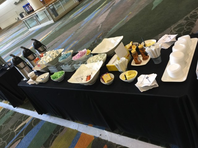 There is plenty of marginal English Breakfast tea packets to be had. Sadly, there is no viable alternative to half and half being offered, so I’ve probably drunk a quart of it by now via the countless tiny single-serving thingys I’ve used to spike my marginal tea.