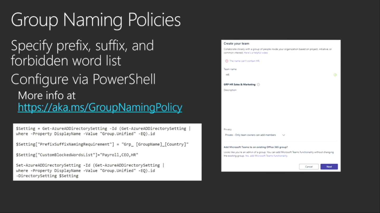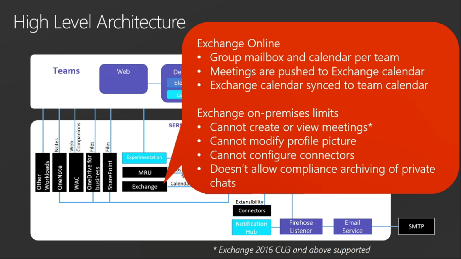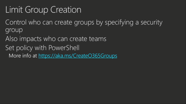 The slides contain the pertinent links to the PowerShell scripts to limit O365 group creation. That was alluded to in a previous session, but they were kind enough to link them here. The Teams experience is heavily reliant on Outlook in the cloud, so it would be impossible for us now. But it is yet another indication of how important Outlook in the cloud is to a successful MS 365 experience. Without it, the experience is very “choppy”: some things work, some things don’t. Rather than using MS 365 as a singular collaboration platform, we’ll be using it for point solutions for collaboration.