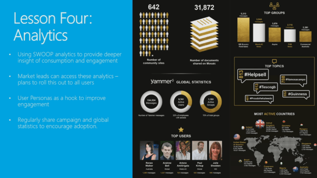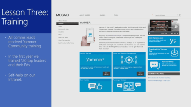 Hear the story of how Diageo became one of the most engaged enterprise networks in the world. From identifying obsolete stock opportunities to sharing stories about how Alia, an archivist at Diageo, uses Yammer to share powerful brand stories from the past to influence products today. Diageo and their Adoption Partner, WM, show us how they created, nurture and analyze this world-class Yammer network.