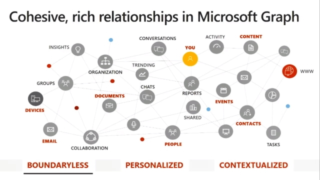 Searching for people will soon bring back results based not only on their AD information, but on the activities they’ve being doing inside of MS365 (documents updated, groups accessed, etc.). The use case was that you heard a colleague was working on a travel document that you wanted to look at, but you don’t know the title other than it probably contains the word “travel”. They demonstrated how it would found faster by searching on the colleague’s name rather than a generic search for “travel”. It came up as the first result for that person under files.