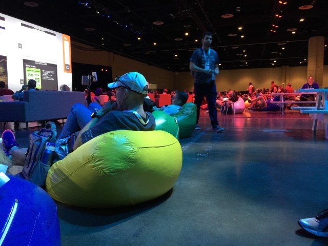 So there is this magical place called the West Expo Center. It contains a wall of 18 presentations running simultaneously. You pull up a beanbag, plug into one of the receivers, and switch between the 18 presentations. I was unaware of this most awesome way to take in a conference, but the folks from TCF were. We spent the entire AM flipping between presentations, drinking coffee & tea, and lounging in beanbags commiserating about trying to roll out O365.