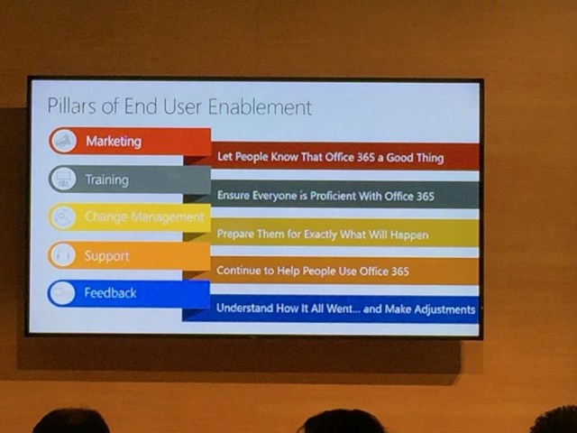 One of the things that makes any conference “totally awesome” is hearing what didn’t work. I want to hear about the struggles. I want to hear how obstacles were overcome. If GE indeed solved every business issue ever with Microsoft, I want the details. I seriously doubt registering each user with an O365 Pro Plus account was all it took. They did use O365 Pro Plus as a precursor to moving to Outlook in the cloud. They big gain for them was the 50GB mailbox size. I guess if you can shift the storage problem to someone else–mission accomplished! New term “Employee Delighter”–I’m going to be saying that all the time from now on.