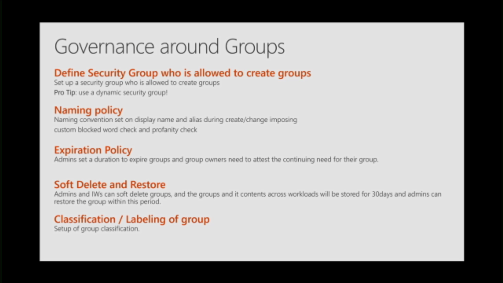 Apparently, it is very common for companies to disable O365 Groups before a full O365 deployment??? She highly recommends a governance and naming policy for O365 Groups. One way to enforce these is to create a workflow that requires someone to “OK” the group creation/name.